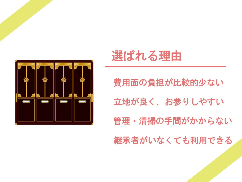 また、都市部などに立地しアクセスに優れていることが多く、「お墓参りに行きやすい」といった理由から、近年利用者が増えています。